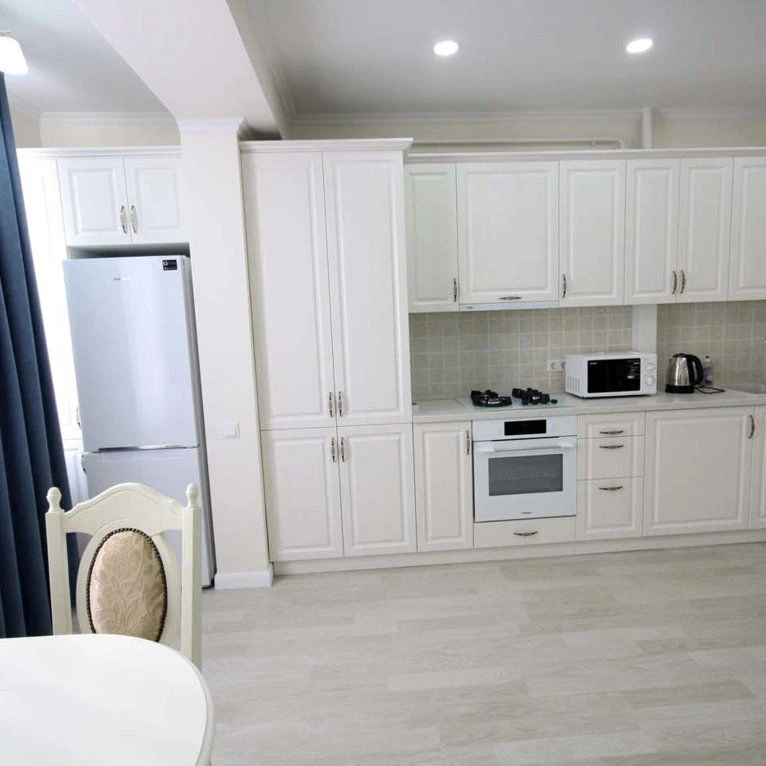 Кухня: просторная, встроенная мебель, микроволновка, холодильник, газовая плита, духовка, вытяжка, кухонный стол с 4 стульями, стиральная машинка Samsung,