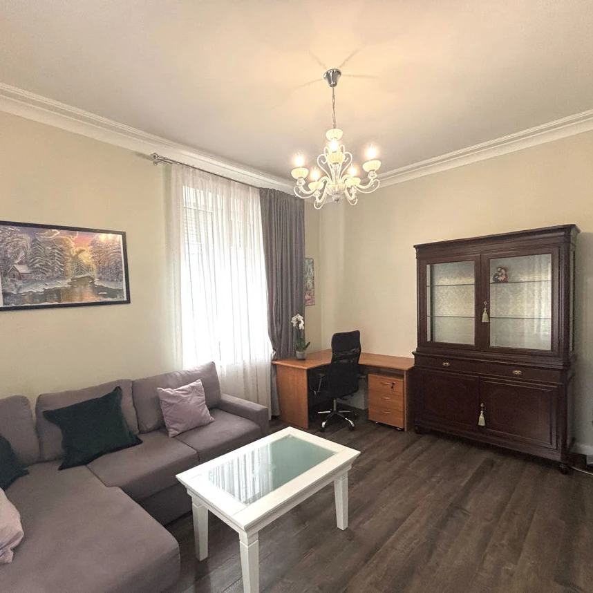 The apartment is divided into 2 rooms; in the second room, the sofa is convertible. There is a kitchen and a separate bathroom with heated floors.