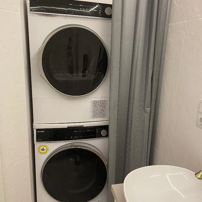 Есть стиральная и сушильная машины, встроенная посудомоечная машина, индукционная ворочная панель и духовка. Из прочей необходимой техники - кондиционер, холодильник, электрический чайник. По запросу можно привезти телевизор.